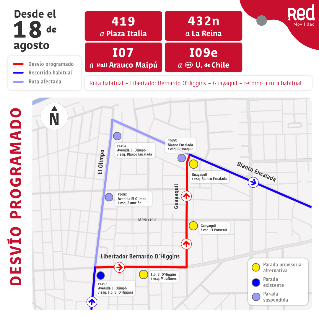 In this way, the affected services are 419, 432n, I07 and I09e. It is important to consider that these routes will encounter detours until approximately mid-November. Likewise, on Tuesdays and Fridays they will present different routes due to the installation of the fair that is located in Libertador Bernardo O’Higgins.