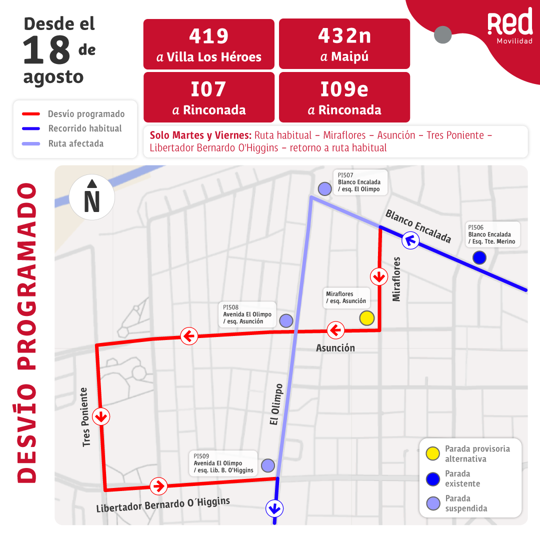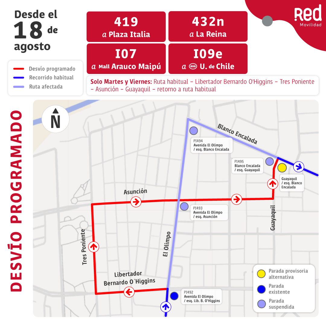 Santiago, August 22.- On Monday, August 18, paving work began on El Olimpo Street, between Aguada Sur and Libertador Bernardo O’Higgins, in the commune of Maipú, affecting the usual layout of four Red Movilidad bus routes.