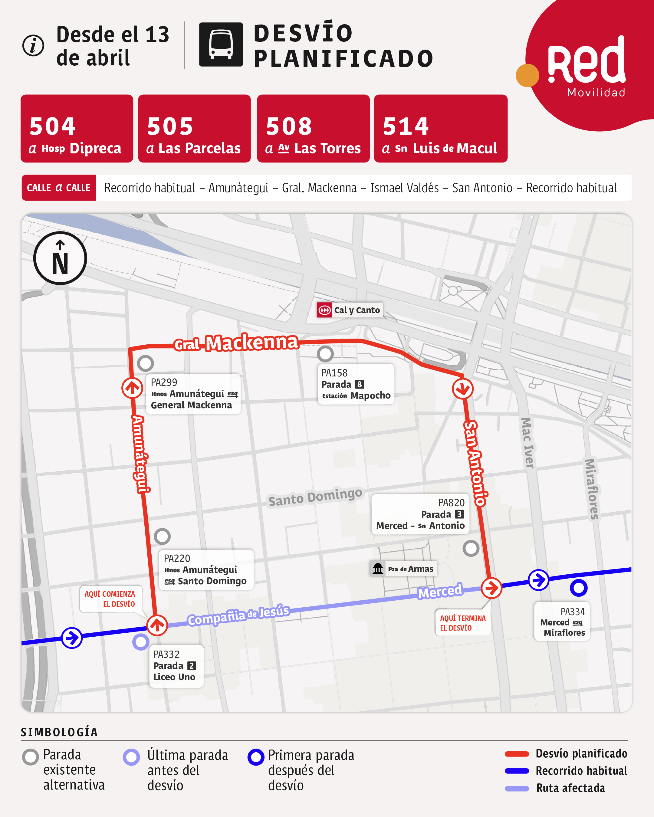 Santiago, 08 de abril.- En el marco de la próxima apertura al tránsito de transporte público en el eje Bandera, en la comuna de Santiago, a partir del lunes 13 de abril se cerrará la calle Compañía, entre Morandé y Ahumada, ocasionando cambios en los trazados habituales de cinco recorridos de buses de Red Movilidad.