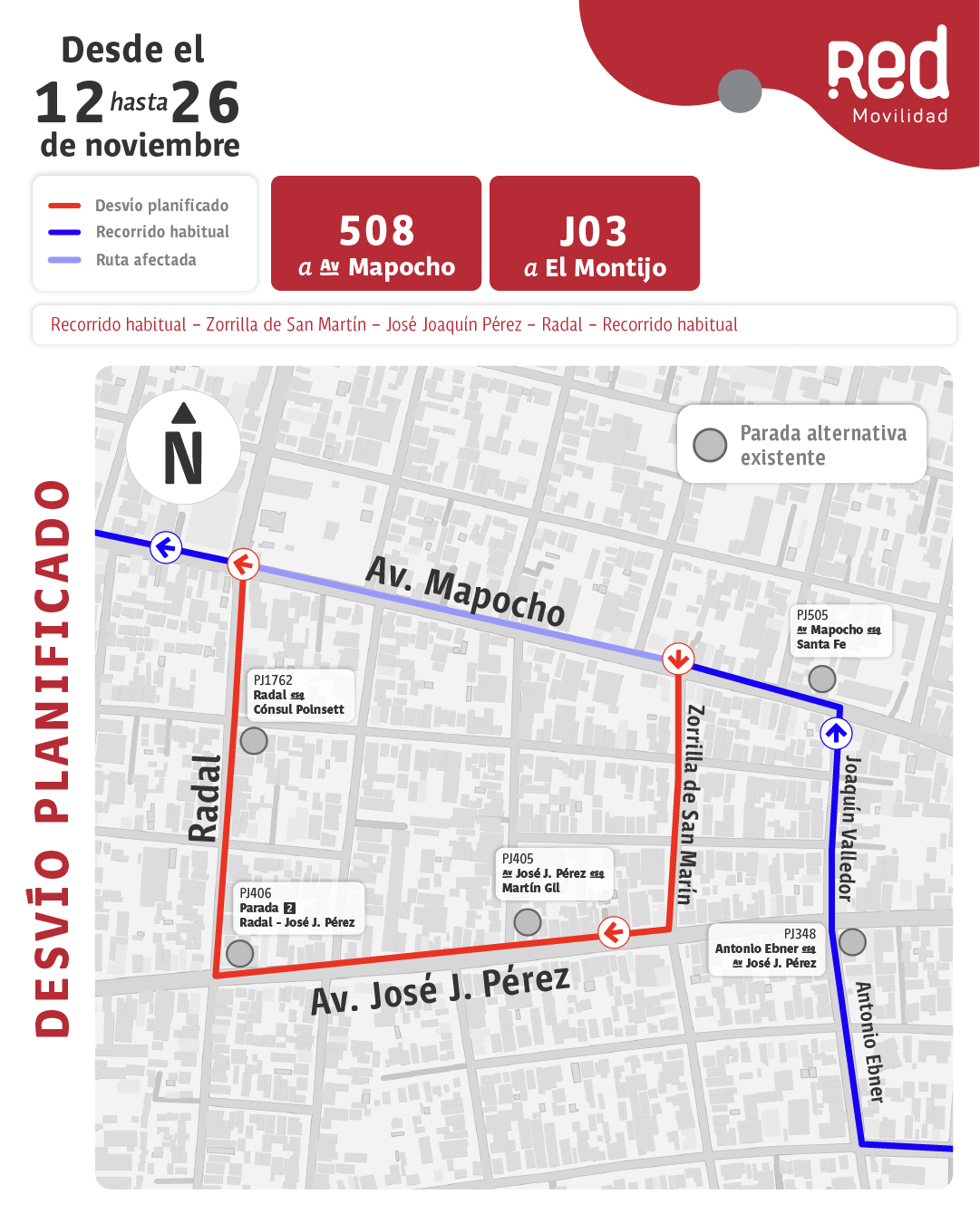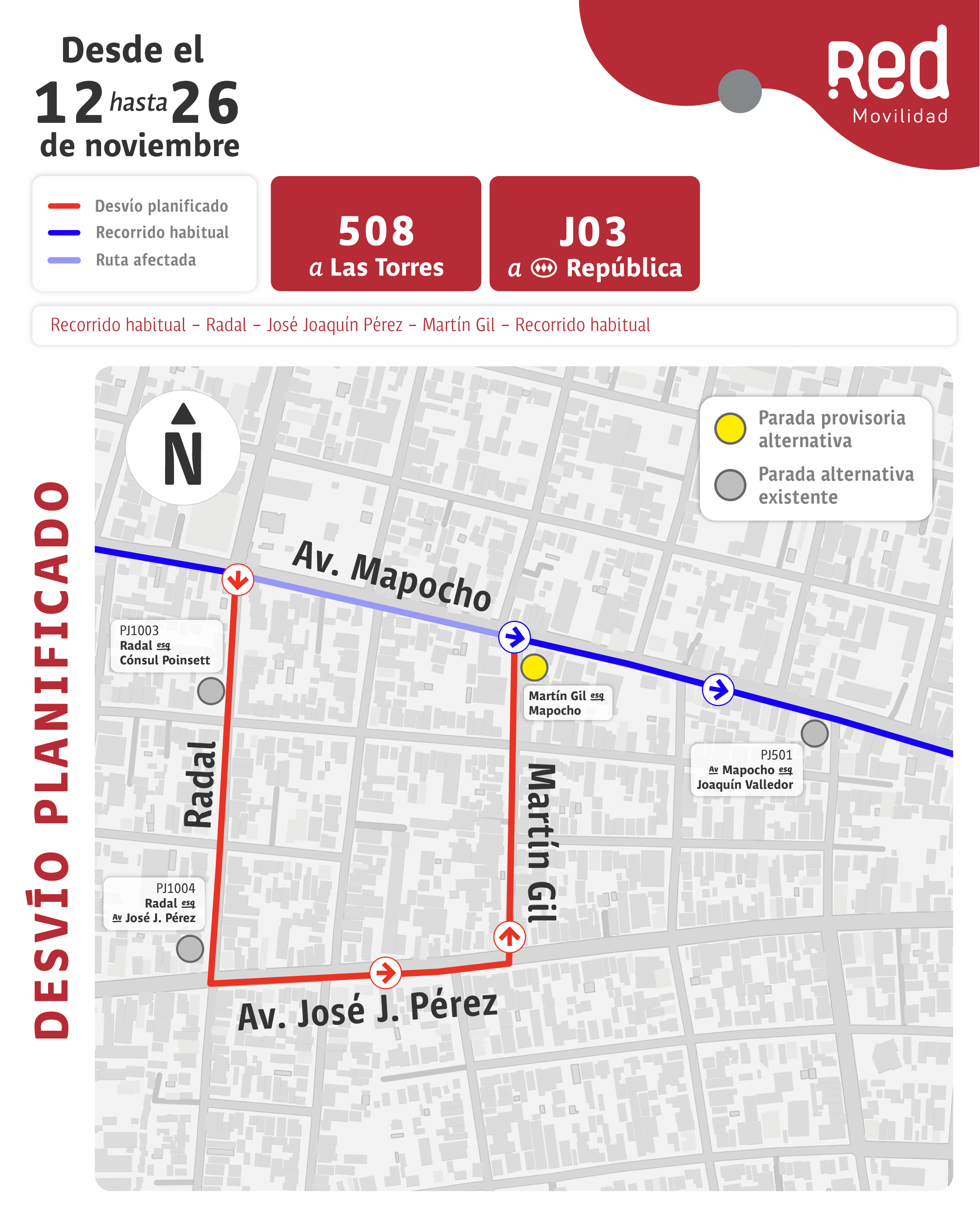 - En direction est (508 au départ, J03 au départ) : Itinéraire habituel – Radal – José Joaquín Pérez – Martín Gil – Itinéraire habituel (voir carte)