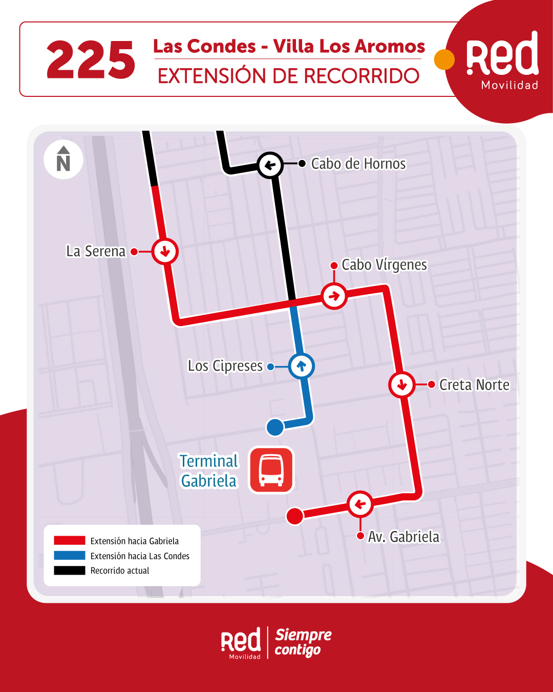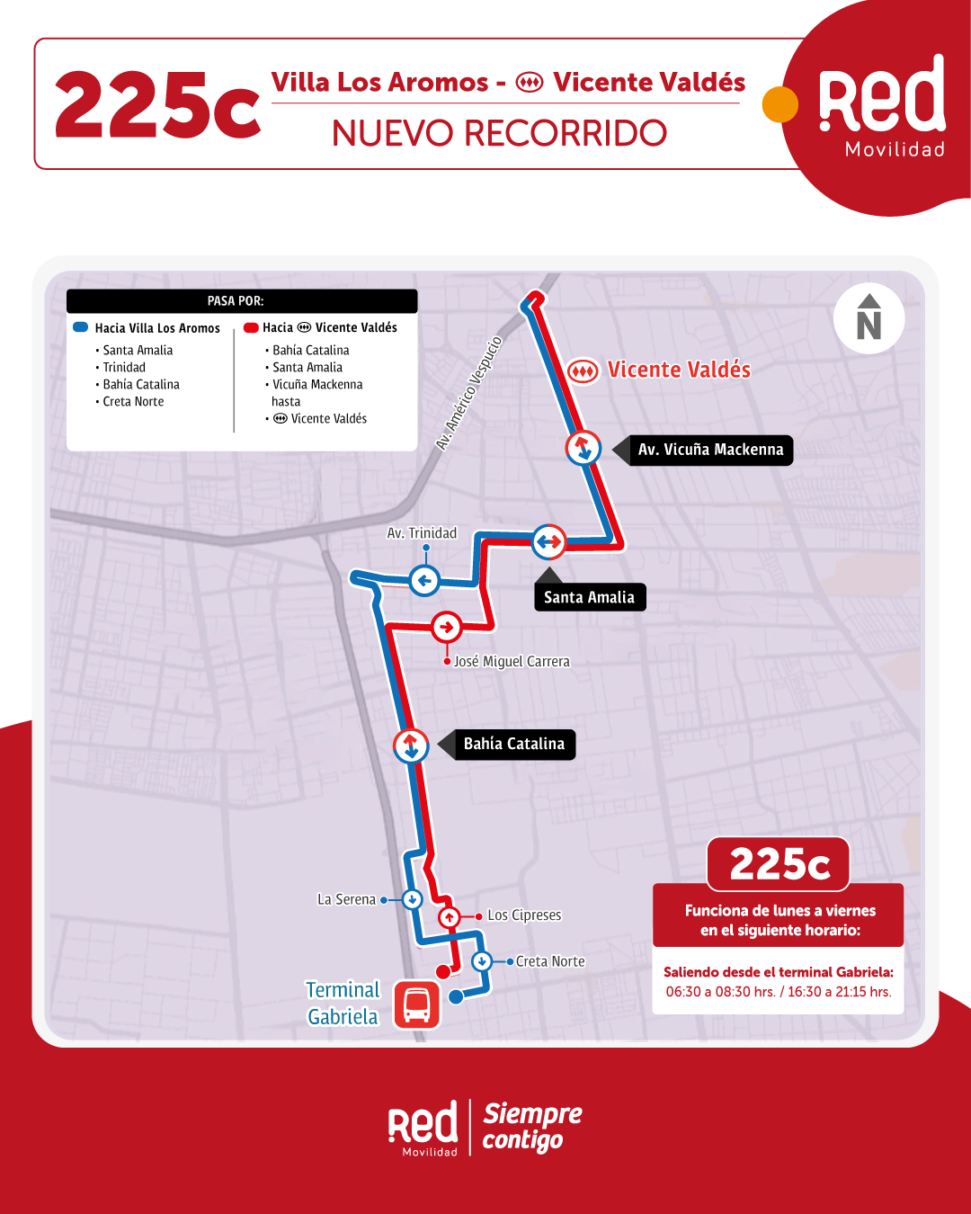 Enfin, la nouvelle 225c commence à fonctionner entre la Villa Los Aromos, à Puente Alto, et le métro Vicente Valdés. Ce service fournit un soutien à la ligne 225 entre cette station de métro et La Serena pendant les heures de pointe.