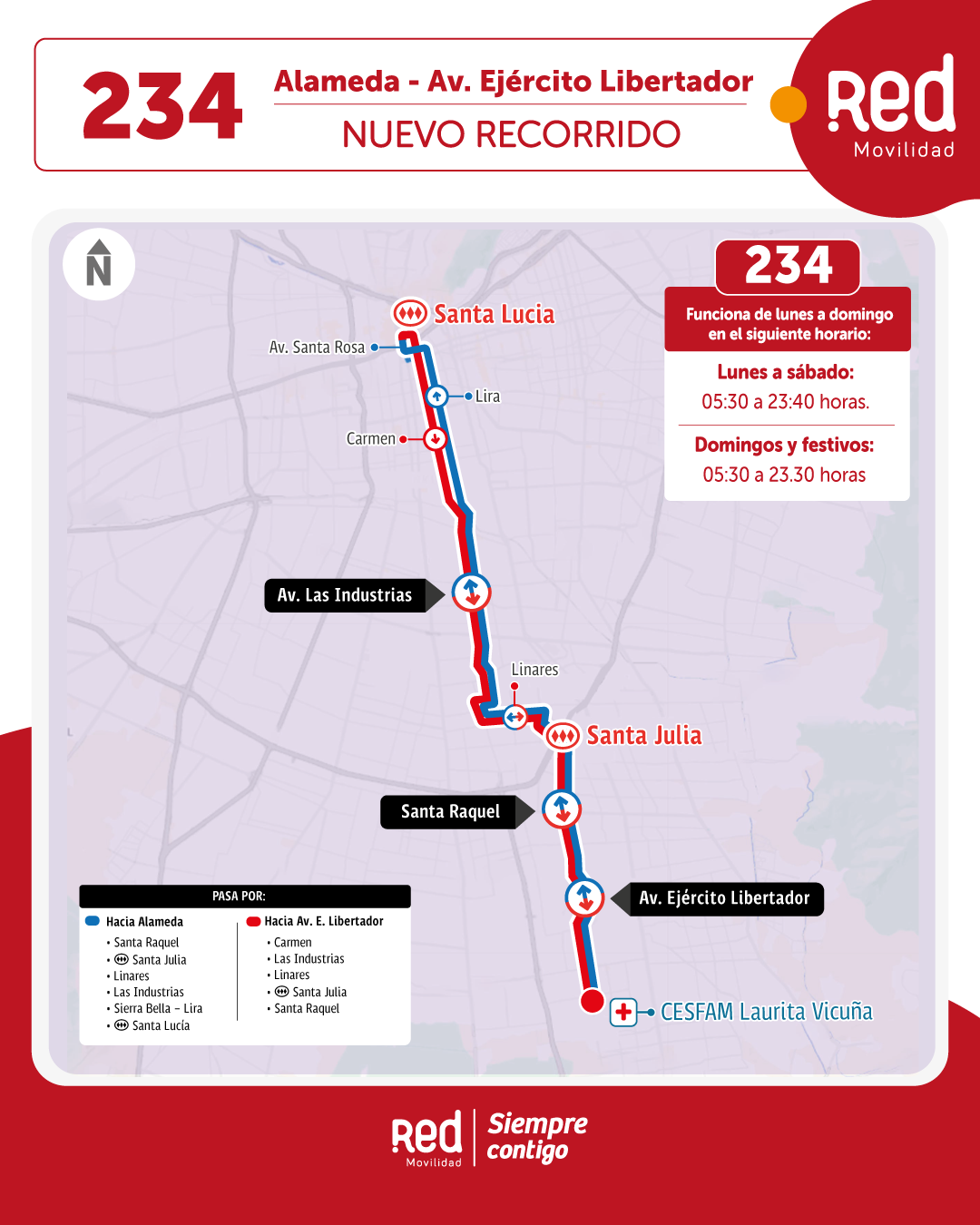 La nouvelle ligne 234 commence à fonctionner entre les communes de Santiago et Puente Alto. Ce service renforce la route 204 et remplace la route 204e qui cesse de fonctionner. En outre, il ajoute de nouveaux arrêts, améliorant les temps d’attente dans les quartiers de Santiago, San Joaquín, La Granja, La Florida et Puente Alto.