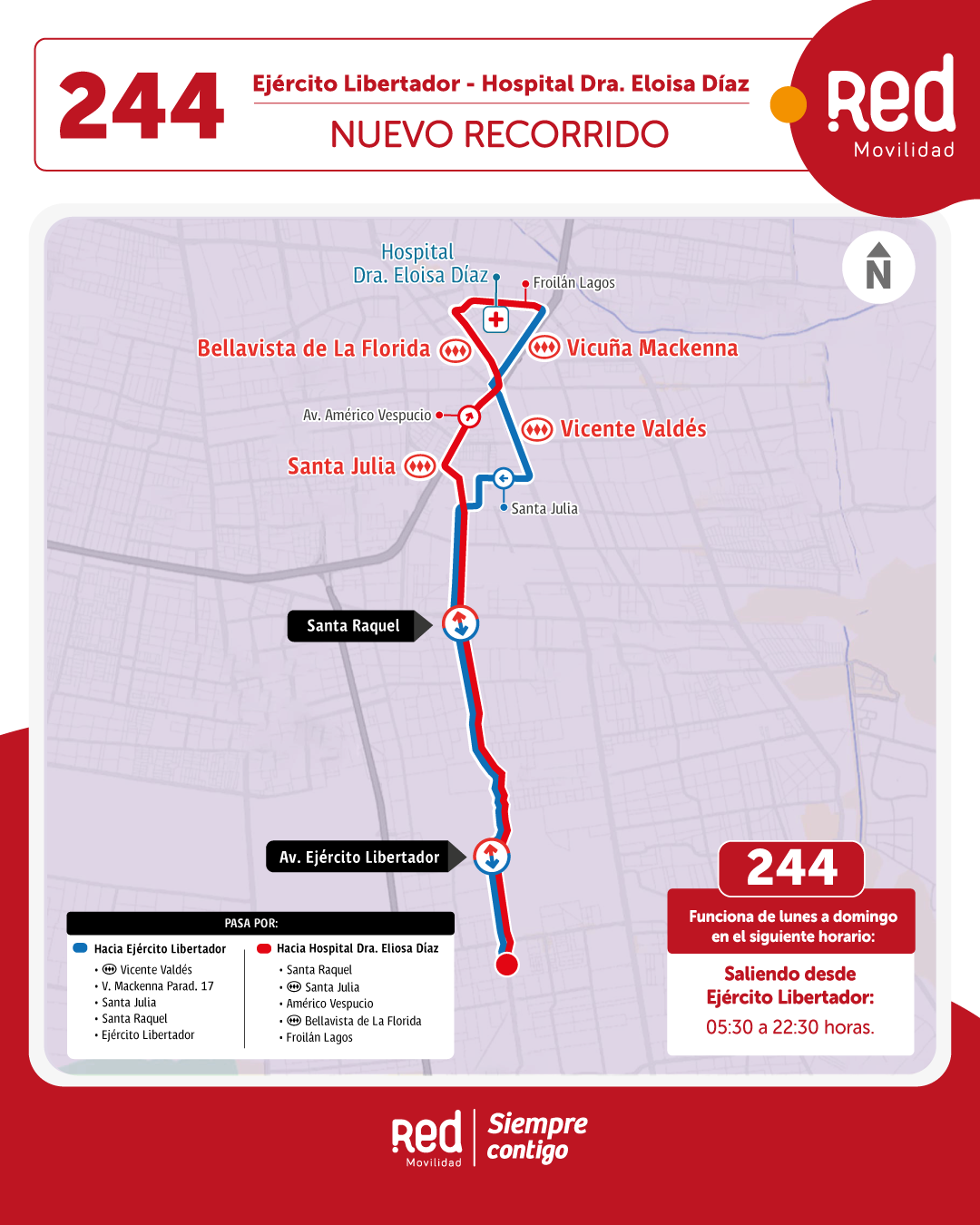 Entre-temps, la nouvelle ligne 244 remplace la ligne 224c qui cesse d’offrir du service. La 244 prolonge son itinéraire vers le nord pour rejoindre l’hôpital Dr. Eloisa Díaz, dans la commune de La Florida.