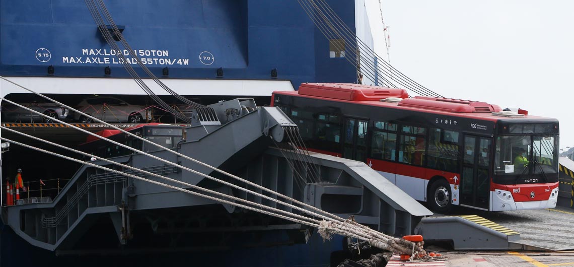 Los vehículos desembarcados en Terminal DP World salieron desde China en julio y continuarán llegando de forma paulatina hasta diciembre. Es una de las flotas más grande de buses eléctricos que sale desde ese país al mundo.