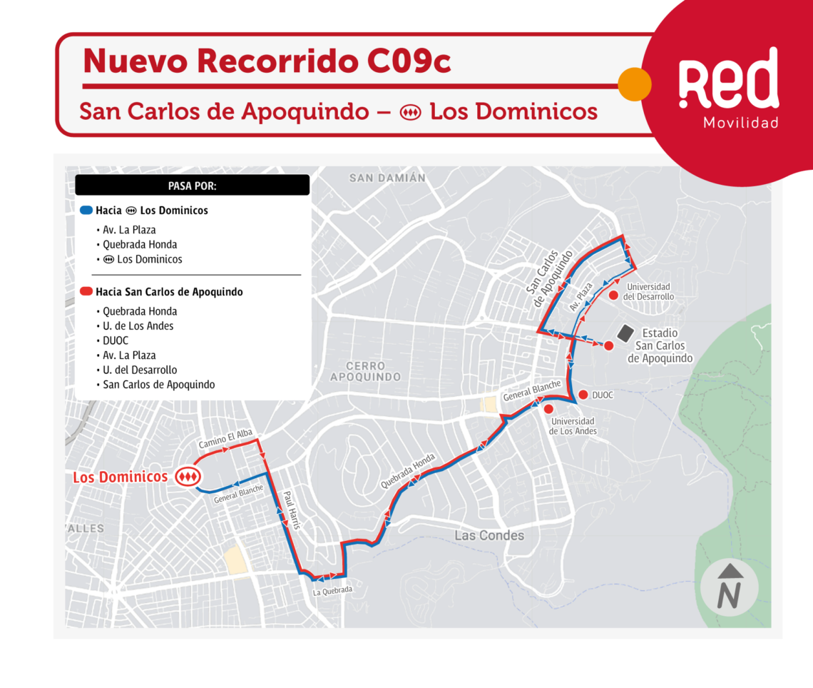 Por otro lado, el nuevo recorrido C09c se incorpora al sistema para ofrecer una nueva alternativa de viaje entre San Carlos de Apoquindo y el Metro Los Dominicos, tramo de alta demanda de usuarias y usuarios. Este servicio funcionará en los horarios punta: de lunes a viernes entre 05:30 y 08:45 hrs. y entre 16:30 y 20:15 hrs. y los días sábado entre 06:30 y 09:50 hrs.