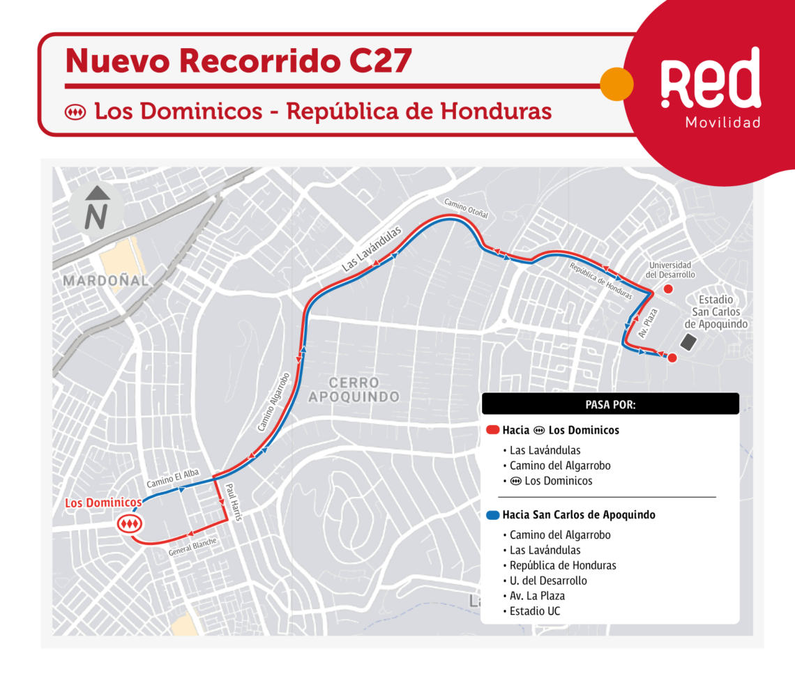 El nuevo recorrido C27 conecta el sector de República de Honduras y Camino Las Lavándulas con el Metro Los Dominicos. Este servicio funcionará de lunes a viernes entre 05:30 y 22:40 hrs. Sábados entre 06:00 y 22:40 hrs. y domingos y festivos entre 06:30 y 22:30 hrs.