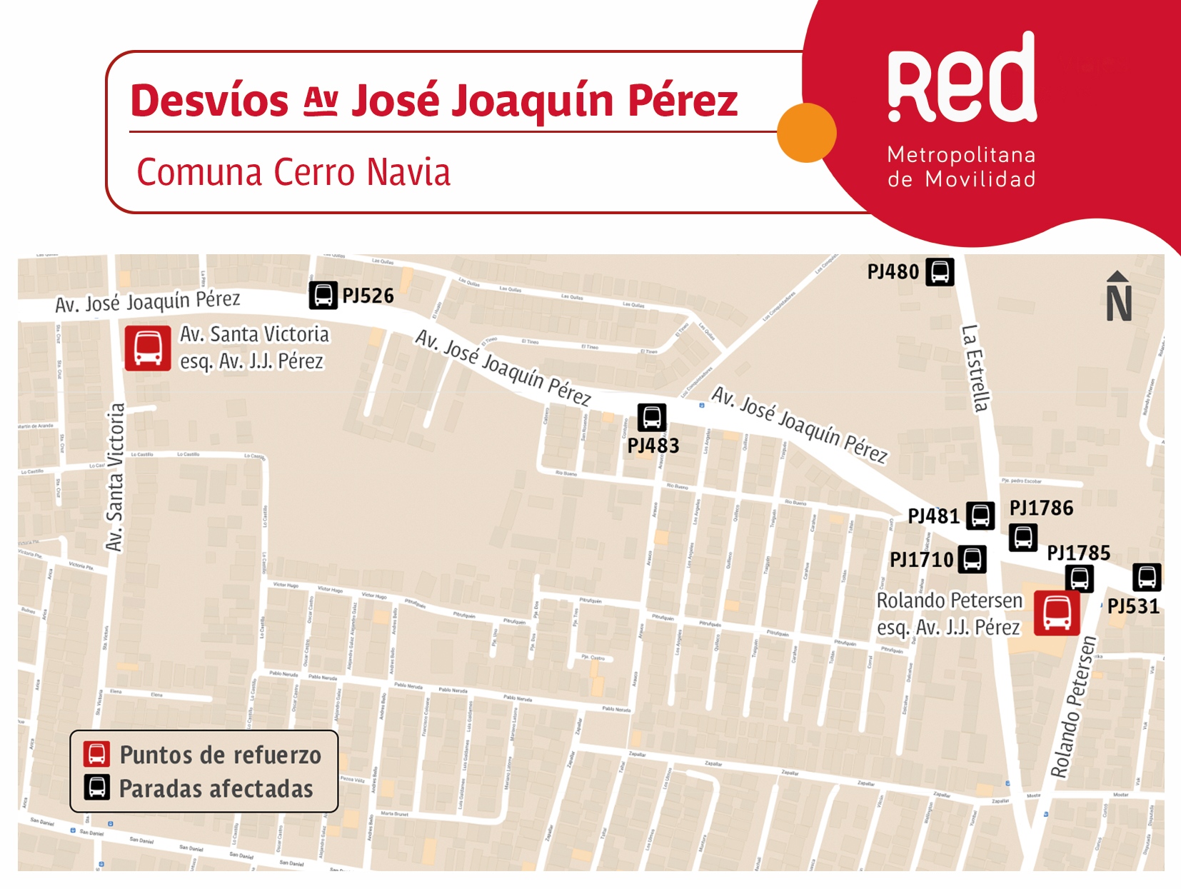 Santiago, 15 de julio.- Debido a la caída de varios postes de luz en La Estrella, entre J.J. Pérez y El Conquistador, comuna de Cerro Navia, Enel se encuentra realizando trabajos de reparación en el lugar, lo que ha ocasionado que los recorridos 508, 412, 507, J07, J07e, 511, J15, J20, 517, 518, 513 y 408 estén realizando desvíos, situación que se prolongará hasta que duren las obras.