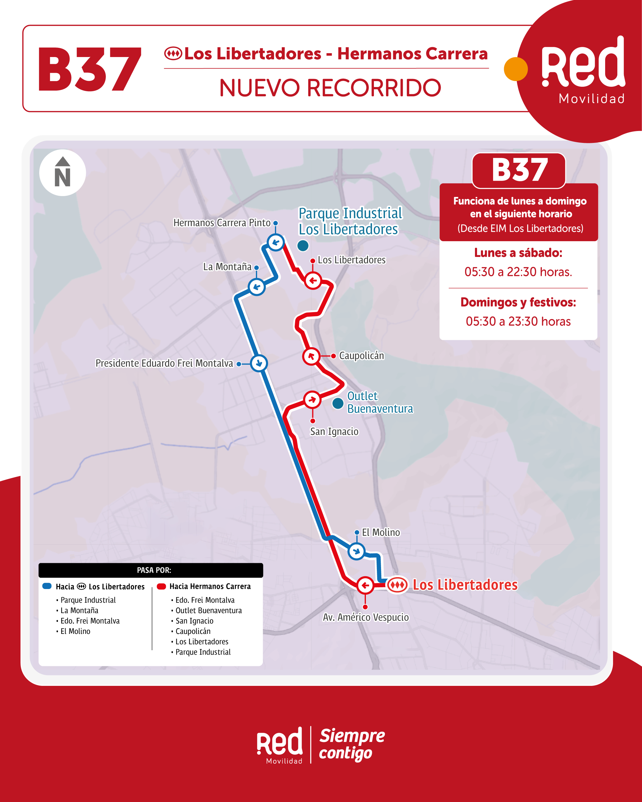Hacia Los Libertadores el nuevo B37 pasa por los siguientes hitos: Parque Industrial, La Montaña, Edo. Frei Montalva, El Molino. En tanto, en su trazado hacia el Parque Industrial transita por: Edo. Frei Montalva, Outlet Buenaventura, San Ignacio, Caupolicán, Los Libertadores, Parque Industrial.