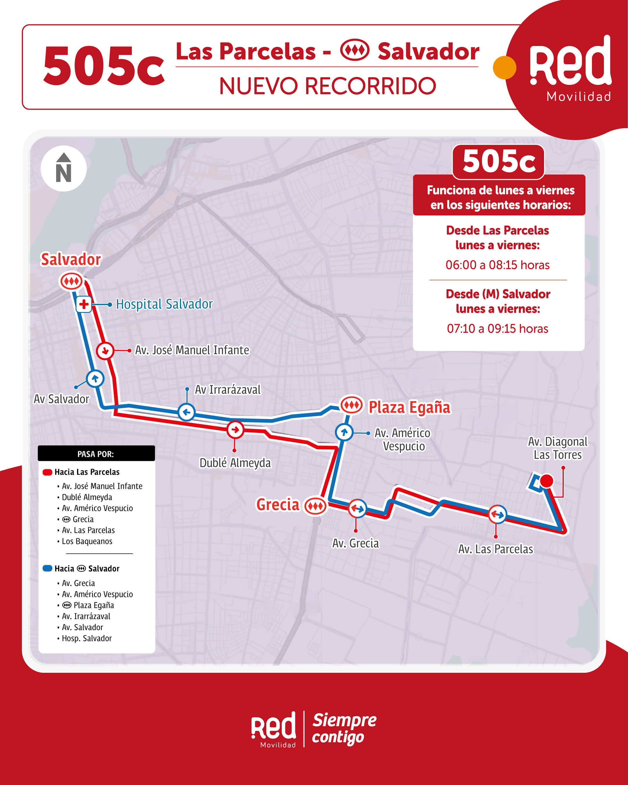 En tanto, el nuevo recorrido 505c, que comienza a entregar servicio el lunes 09 de marzo, opera en la zona oriente de Santiago, conectando sectores de Peñalolén, Ñuñoa y Providencia con el Metro Salvador. (Ver mapa nuevo 505c)