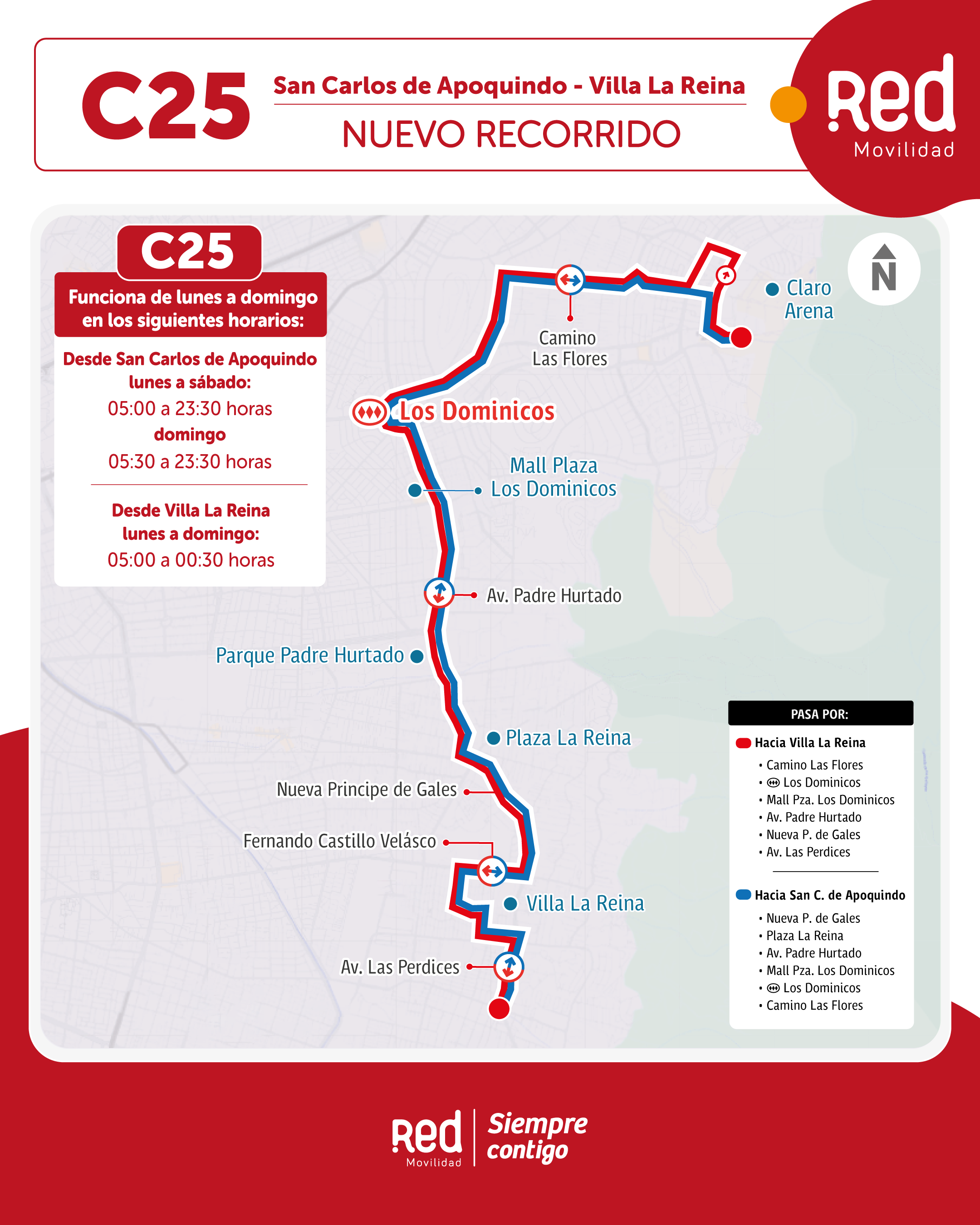 El nuevo recorrido C25, que comienza su operación el sábado 07 de marzo, entrega una conexión directa entre las comunas de Las Condes, La Reina y Peñalolén. Este servicio permite que los vecinos y vecinas de Villa La Reina y Plaza La Reina accedan al Metro Los Dominicos y San Carlos de Apoquindo, además de centros comerciales de Av. Padre Hurtado. (Ver mapa nuevo c25)