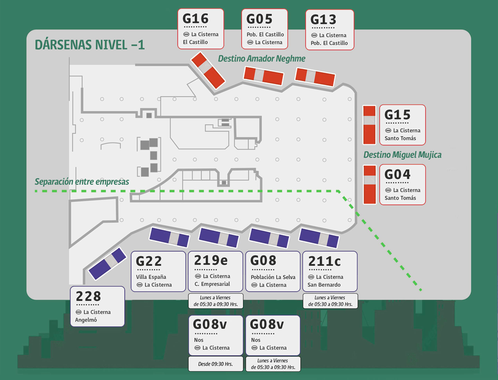 Santiago, 21 de noviembre.- A partir del sábado 19 de noviembre, las paradas de los recorridos de buses del sistema Red que se detienen al interior de la EIM de La Cisterna, se redistribuyeron con el objeto de mejorar la operación de estos servicios, pues ahora se agruparán por empresas operadoras, orígenes y destinos comunes y frecuencias de salida. También, se consideraron aspectos como las filas de las usuarias y usuarios y la distribución de las zonas pagas para hacer el ajuste.