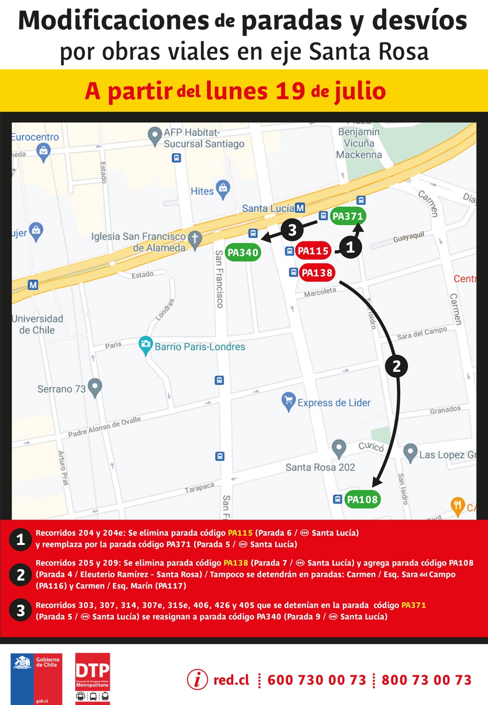 - Recorridos 303, 307, 314, 307e, 315e, 406, 426 y 405: no se detienen en la Parada 5 / (M) Santa Lucía (PA371). Ahora se detienen en Parada 9 / (M) Santa Lucía (PA340)