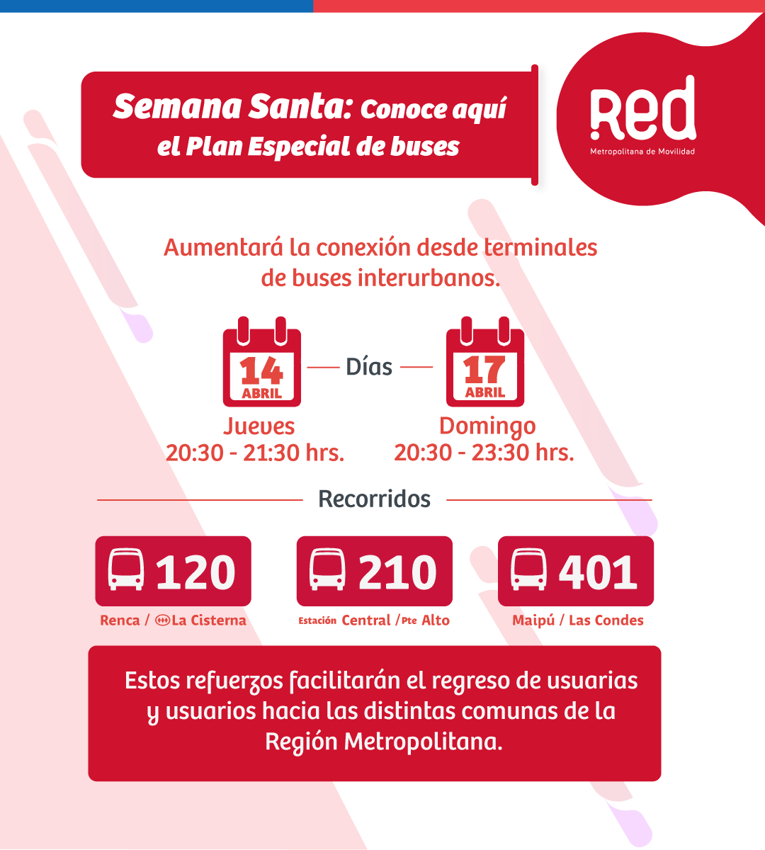 El jueves 14 de abril, los servicios de buses tendrán un reforzamiento de frecuencia hacia Estación Central, llegando a duplicar la operación habitual entre las 20:30 y las 21:30 horas. El recorrido 120, que permite la conexión de las comunas de Renca, Quinta Normal, Pedro Aguirre Cerda y Lo Espejo -a través del eje General Velásquez-, tendrá un 60% más de salidas.