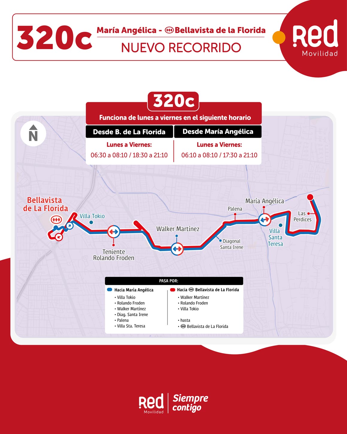 Asimismo, el nuevo servicio 320c reforzará la operación del recorrido 320 en el extremo poniente, entre Bellavista de La Florida y María Angélica, durante los periodos punta.